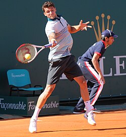 At the French Open, Dimitrov was seeded 26th, thus becoming the first ever Bulgarian male tennis player to be seeded at a Grand Slam tournament.[71] He beat Alejandro Falla in the first round, after the Colombian retired trailing one set to love and one game down in the second set, citing an elbow problem.[72] Dimitrov eliminated wildcard world No. 324, Lucas Pouille, in straight sets in the second round, thus becoming the first ever Bulgarian male tennis player to reach the third round of a Grand Slam.[73] He lost in straight sets against world No. 1, Novak Djokovic, in the third round.[74] Dimitrov also played in the doubles with partner Frederik Nielsen losing in straight sets to seventh seeded Alexander Peya and Bruno Soares in the second round.