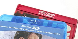 [edit]Much like the videotape format war between VHS and Betamax, HD DVD was competing with a rival format, Blu-ray Disc.