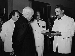 In the immediate period following the establishment of the bilateral relations the Embassy of Yugoslavia in London was responsible for Yugoslav relations with India, while the Embassy of India in Rome was responsible for Indian relations with Yugoslavia.[1] The Embassy of Yugoslavia in India (New Delhi) and the Consulate in Bombay were established as early as 1950.[1] In late 1954 and early 1955 President of Yugoslavia Josip Broz Tito visited India for the first time.[3] Tito was the first European leader who visited India after the independence of the country.[4] Indian Prime Minister Jawaharlal Nehru returned the visit in late June and early July 1955.[3]