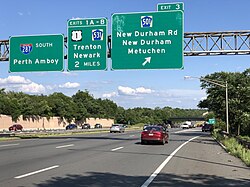 I-287 begins at an interchange with the New Jersey Turnpike (I-95) in Edison in Middlesex County, New Jersey, where the freeway continues east as Route 440 toward Perth Amboy and Staten Island.[2][3] Within Middlesex County, I-287 is called the Lt. Col. (Ret) Richard F. Lauer, US Army Highway.[2] From this point, it heads west as an eight-lane freeway through suburban areas, soon reaching an interchange with US 1 that also has access to County Route 531 (CR 531) in the southbound direction. Past this point, the road turns more to the northwest and passes under Conrail Shared Assets Operations's Bonhamtown Industrial Track line and a railroad spur before it comes to the junction with Route 27 (Lincoln Highway).[2][3] Following Route 27, I-287 narrows to six lanes and passes over Amtrak's Northeast Corridor as it continues to a southbound exit and northbound entrance with CR 501.[2]