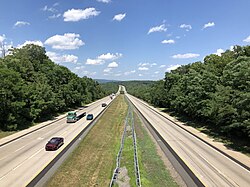 Following this interchange, the freeway becomes six lanes, with three in each direction as it continues into more wooded areas and reaching an exit with access to US 46 and US 202/CR 511. In this area, the highway runs to the west of the Boonton Reservoir and immediately to the east of US 202/CR 511.[2][3] I-287 comes to the Intervale Road exit, which carries US 202 and CR 511. The freeway enters Boonton, where it turns northeast, with NJ Transit's Montclair-Boonton Line located a short distance to the northwest.[2] In Boonton, there is another interchange with US 202/CR 511. From here, I-287 curves more to the east, with US 202 running immediately to the north of the road.[2][3] Along this stretch, there is an exit for US 202 and Vreeland Avenue.[2] Upon entering Montville, the passes near wooded residential areas before coming to another interchange with US 202. I-287 continues northeast from this point, drawing away from US 202, crossing under NJ Transit's Montclair-Boonton Line before running north-northeast through more woodland as the terrain starts to get more mountainous. This stretch of I-287 continues for six miles (9.7 km) before its next exit.[2][3] The freeway runs through Kinnelon, where the northbound direction has four lanes, and Pequannock Township before entering Riverdale. In Riverdale, there is an interchange with Route 23. A short distance later, I-287 reaches the CR 694 interchange which provides access to CR 511 Alternate (CR 511 Alt.).[2]