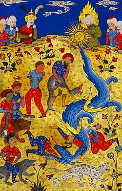 Musa during his victorious battle against the Pharaoh's magicians, casting divine light with his hand and turning his staff into a dragon. | |