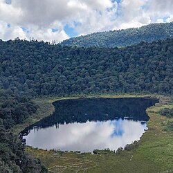 [edit]The lake was the original névé (term used to define formation of a glacier from compact granular snow) region of ancient precipitous glaciers. The depression where the lake is situated was formed by the scooping action of the glacier. It forms the southern bank of the Lethang valley. The formation of the lake is estimated to be 3500 years old.[2] The lake is situated amidst pristine forest at an altitude of 1,700 metres (5,600 ft) near Tsozo village.[2] The lake drains a catchment area of the Ramam watershed (Ramam mountain gives its name to the valley) and has a drainage area of 12 square kilometres (4.6 sq mi) (including area of bog of 70,100 square metres (755,000 sq ft). The periphery of lake has the shape of a foot. The surface water spread area of the lake is 3.79 hectares (9.4 acres). The depth of water in the lake varies from 3.2–11.2 metres (10–37 ft) with an average depth of 7.2 metres (24 ft).[2] It is also inferred from a visual observation of the lake that it has undergone changes in its size due to encroachment due to peripheral vegetation and eutrophication, and its original size could have been three times of its present size. The lake's water spread, which was 7.4 hectares (18 acres) in 1963 reduced to 3.8 hectares (9.4 acres) in 1997 and consequently the peatland (bog) increased from 3.4–7 hectares (8.4–17.3 acres). Inflow into the lake is through two perennial and five non perennial streams, while the outflow is from one outlet. In addition, during the monsoon season two streams are also diverted temporarily into the lake to supplement its storage capacity. The geological setting in the lake and its surrounding hills consist of granite gneiss, schist and phyllites.[2][3][9]