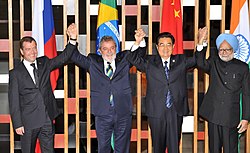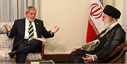 Lula, described as left-wing, served two terms as president from 2003 through 2010.[42][43] During his farewell speech, he said he felt a burden to prove that he could handle the presidency despite his humble beginnings. "If I failed, it would be the workers' class which would be failing; it would be this country's poor who would be proving they did not have what it takes to rule".[44][45]