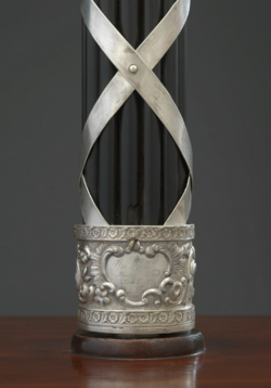 The design of the mace is derived from an ancient battle weapon and the Roman fasces. The ceremonial mace is 46 inches (120 cm) high and consists of 13 ebony rods—representing the original 13 states of the Union—bound together by silver strands criss-crossed over the length of the pole. The rods are bound together by four crossing ribbons of silver, pinned together and held at the bottom and at the top by silver bands. The bands are decorated with floral borders and a repoussé design. The name “Wm. Adams/Manufacturer/New York/1841.” is engraved in the cartouche, located in the front center of the bottom band. This shaft is topped by a silver globe 4-1/2 inches in diameter and engraved with the seven continents, the names of the oceans, lines of longitude, and the major lines of latitude. The Western Hemisphere faces the front. The globe is encircled with a silver rim marked with the degrees of latitude, on which is perched an engraved solid silver eagle with a wingspan of 15 inches. The total weight of the mace is 13 pounds.[6]