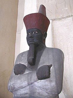 Mentuhotep II commanded petty campaigns as far south as the Second Cataract in Nubia, which had gained its independence during the First Intermediate Period. He also restored Egyptian hegemony over the Sinai region, which had been lost to Egypt since the end of the Old Kingdom.[7] To consolidate his authority, he restored the cult of the ruler, depicting himself as a god in his own lifetime, wearing the headdresses of Amun and Min.[8] He died after a reign of 51 years and passed the throne to his son, Mentuhotep III.[7]