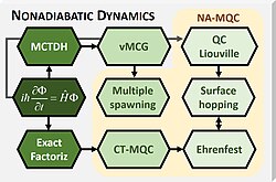 [edit]NA-MQC dynamics are approximated methods to solve the time-dependent Schrödinger equation for a molecular system. Methods like TSH, in particular in the fewest switches surface hopping (FSSH) formulation, do not have an exact limit.[19] Other methods like MS or CT-MQC can in principle deliver the exact non-relativistic solution.[10][11]