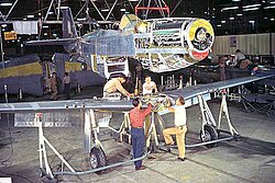 The other feature was a new cooling arrangement positioned aft (single ducted water and oil radiators assembly) that reduced the fuselage drag and effects on the wing. Later,[21] after much development, they discovered that the cooling assembly could take advantage of the Meredith effect, in which heated air exited the radiator with a slight amount of jet thrust. Because NAA lacked a suitable wind tunnel to test this feature, it used the GALCIT 3.0 m (10 ft) wind tunnel at the California Institute of Technology. This led to some controversy over whether the Mustang's cooling system aerodynamics were developed by NAA's engineer Schmued or by Curtiss, as NAA had purchased the complete set of P-40 wind tunnel data and flight test reports.[22][23] The NA-73X was also one of the first aircraft to have a fuselage lofted mathematically using conic sections; this resulted in smooth, low-drag surfaces.[24] To aid production, the airframe was divided into five main sections—forward, center, rear fuselage, and two wing halves—all of which were fitted with wiring and piping before being joined.[24]