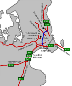 [edit]The Helsingør Motorway, part of European route E47, connects Copenhagen to Helsingør with exits at Espergærde, Humlebæk, Nivå, Kokkedal, Hørsholm, Vedbæk, Gl. Holte, Nærum, Lundtofte and Lyngby.[57] The Hillerød Motorway (Hillerødmotorvejen) covers the first 19 km (12 mi) of Route 16 between Copenhagen and Hillerød via Farum, continuing as an expressway.[58]