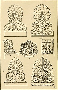 As an ornamental motif found in classical architecture, the palmette and anthemion[14] take many and varied forms.[15] Typically, the upper part of the motif consists of five or more leaves or petals fanning rhythmically upwards from a single triangular or lozenge-shaped source at the base. In some instances fruits resembling palm fruits hang down on either side above the base and below the lowest leaves. The lower part consists of a symmetrical pair of elegant 'S' scrolls or volutes curling out sideways and downwards from the base of the leaves. The upper part recalls the thrusting growth of leaves and flowers, while the volutes of the lower part seem to suggest both contributing fertile energies and resulting fruits. It is often present on the necking of the capital of Ionic order columns; however in column capitals of the Corinthian order it takes the shape of a 'fleuron' or flower resting against the abacus (top-most slab) of the capital and springing out from a pair of volutes which, in some versions, give rise to the elaborate volutes and acanthus ornament of the capital.