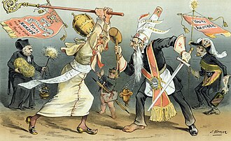 [edit]In Praeclara gratulationis publicae, Leo XIII namely stated about Freemasonry: "Although We have spoken on this subject in the strongest terms before, yet We are led by Our Apostolic watchfulness to urge it once more, and We repeat Our warning again and again, that in face of such an eminent peril, no precaution, howsoever great, can be looked upon as sufficient. May God in His Mercy bring to naught their impious designs; nevertheless, let all Christians know and understand that the shameful yoke of Freemasonry must be shaken off once and for all; and let them be the first to shake it off who are most galled by its oppression–the men of Italy and of France. With what weapons and by what method this may best be done We Ourselves have already pointed out: the victory cannot be doubtful to those who trust in that Leader Whose Divine Words still remain in all their force: I have overcome the world."[28]