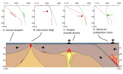 [edit]Main process responsible for the generation of basaltic melts on certain settings, such as rift zones in continents, back-arc basins, seafloor spreading zones and intraplate hotspots. Plate tectonics and mantle convection are responsible for the transportation of hot and less dense rock towards the surface. This causes a reduction in pressure without loss of heat, leading to partial melting.[13] At seafloor spreading zones (mid-ocean ridges), hot peridotite ascending from the mantle undergoes partial melting due to a decrease in pressure, generating a basaltic melt and a solid phase. This melt when extruded on the surface is responsible for the creation of new oceanic crust. In continental rifts, where the lithosphere is colder and more rigid, decompression melting occurs when material from the hot and more plastic asthenosphere is transported to lower pressures.[2]
