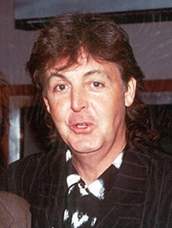 McCartney collaborated with Eric Stewart on Press to Play (1986), with Stewart co-writing more than half the songs on the LP.[128][nb 21] In 1988, McCartney released Снова в СССР, initially available only in the Soviet Union, which contained eighteen covers; recorded over the course of two days.[130] In 1989, he joined forces with fellow Merseysiders Gerry Marsden and Holly Johnson to record an updated version of "Ferry Cross the Mersey", for the Hillsborough disaster appeal fund.[131][nb 22] That same year, he released Flowers in the Dirt; a collaborative effort with Elvis Costello that included musical contributions from Gilmour and Nicky Hopkins.[133][nb 23] McCartney then formed a band consisting of himself and Linda, with Hamish Stuart and Robbie McIntosh on guitars, Paul "Wix" Wickens on keyboards and Chris Whitten on drums.[135] In September 1989, they launched the Paul McCartney World Tour, his first in over a decade. During the tour, McCartney performed for the largest paying stadium audience in history on 21 April 1990, when 184,000 people attended his concert at Maracanã Stadium in Rio de Janeiro, Brazil.[136] That year, he released the triple album Tripping the Live Fantastic, which contained selected performances from the tour.[137][nb 24][nb 25]