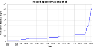 The Persian astronomer Jamshīd al-Kāshī produced nine sexagesimal digits, roughly the equivalent of 16 decimal digits, in 1424, using a polygon with sides,[43] which stood as the world record for about 180 years.[44] French mathematician François Viète in 1579 achieved nine digits with a polygon of
