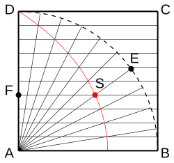 [edit]Consider a square , and an inscribed quarter circle arc centered at