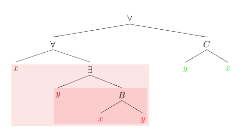 [edit]Mathematical semantics is the application of mathematics to study the meaning of expressions in a formal language. It has three elements: a mathematical specification of a class of objects via syntax, a mathematical specification of various semantic domains and the relation between the two, which is usually expressed as a function from syntactic objects to semantic ones. This article only addresses the issue of how quantifier elements are interpreted. The syntax of a formula can be given by a syntax tree. A quantifier has a scope, and an occurrence of a variable x is free if it is not within the scope of a quantification for that variable. Thus in