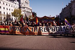 There is a renewed interest in republicanism in Spain after two earlier attempts: the First Spanish Republic (1873–1874) and the Second Spanish Republic (1931–1939). Movements such as Ciudadanos Por la República, Citizens for the Republic in Spanish, have emerged, and parties like United Left and the Republican Left of Catalonia increasingly refer to republicanism. In a survey conducted in 2007 reported that 69% of the population prefer the monarchy to continue, compared with 22% opting for a republic.[82] In a 2008 survey, 58% of Spanish citizens were indifferent, 16% favored a republic, 16% were monarchists, and 7% claimed they were Juancarlistas (supporters of continued monarchy under King Juan Carlos I, without a common position for the fate of the monarchy after his death).[83] In recent years, there has been a tie between Monarchists and Republicans.[84][85]