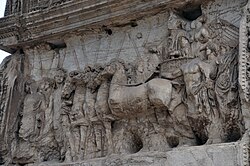 On the Arch of Titus (1st-century CE), the arch of Septimius Severus and the arch of Constantine, Roma accompanies the emperor in his chariot, as his escort.