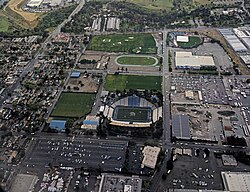 [edit]The SJSU main campus comprises approximately 55 buildings situated on a rectangular, 154-acre (62.3 ha) area in downtown San Jose. The campus is bordered by San Fernando Street to the north, San Salvador Street to the south, South 4th Street to the west, and South 10th Street to the east. The south campus, which is home to many of the school's athletics facilities, is located approximately 1.5 miles (2.4 kilometres) south of the main campus on South 7th Street.[citation needed]