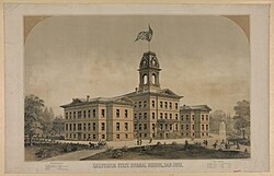In 1868, more serious talks of finding a permanent location for the Normal School began, with a general consensus that the school needed to cut ties with the San Francisco Board of Education and move out of San Francisco. After it became public that the Normal School was looking to move for a permanent location, several cities put in bids to home the school, however after the San Jose Railroad Company paid to have the entire student and faculty body tour the city and potential locations for the school, San Jose became the preferred site.[24] The school moved to San Jose in 1871 and was given Washington Square Park at S. 4th and San Carlos Streets, where the campus remains to this day.[25]