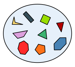 [edit]In mathematics, a set is a collection of different things.[2][3][4][5] These things are called elements or members of the set and are typically mathematical objects of any kind such as numbers, symbols, points in space, lines, other geometrical shapes, variables, functions, or even other sets.[6][7] A set may also be called a collection or family, especially when its elements are themselves sets; this may avoid the confusion between the set and its members, and may make reading easier. A set may be specified either by listing its elements or by a property that characterizes its elements, such as for the set of the prime numbers or the set of all students in a given class.[8][9][10]