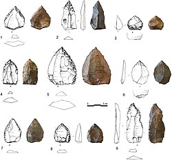 [edit]The pre-Still Bay occupation had a lithic flake-based industry and made few tools. The Still Bay occupation, in addition to such flakes, made bifacial tools and points.[12] Trace use analysis on the tips of the points finds evidence of compound adhesives on their bases where they would once have been hafted to shafts.[13]