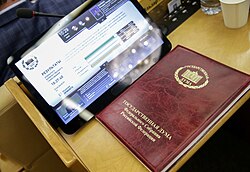 [edit]Any citizen of the Russian Federation aged 21 or older who has the right to participate in elections may be elected as a deputy to the State Duma.[22] However, that same person may not be a deputy to the Federation Council. In addition, a State Duma deputy cannot hold office in any other representative body of state power or bodies of local self-government. The office as deputy of the State Duma is a full-time and professional position.[23] Thus, deputies to the State Duma may not be employed in the civil service or engage in any activities for remuneration other than teaching, research or other creative activities.