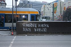 - ^ Berlin: Polizei ermittelt wegen Anti-Schwaben-Schmiererei, Spiegel-Online, May 4, 2013 Nächster Akt im Schwaben-Streit - Sträßlemacher gegen Spätzlekrieg, n-tv.de, 23.2.2013 Neue Runde im Schwaben-Streit - Die Strässlemacher aus Prenzlauer Berg, Tagesspiegel 8.2.2013. Hauptstadt: Gässle und Sträßle im Prenzlauer Berg, Focus Online 10.2. 2013 "Preußisch-schwäbische Versöhnung" - Narrenschelle für den "Schwaben-Goscher", rbb vom 23.1. 2013 Spätzlestreit geht in eine weitere Runde - Krone für Käthe Kollwitz, Tagesspiegel vom 21. Januar 2013. Berliner Kollwitz-Verein plant Protestbrief im "Spätzle-Streit", Deutschlandradio vom 21. Januar 2013 Kollwitz-Denkmal: Berliner Spätzle-Streit geht weiter, Berliner Zeitung 24.2. 2012