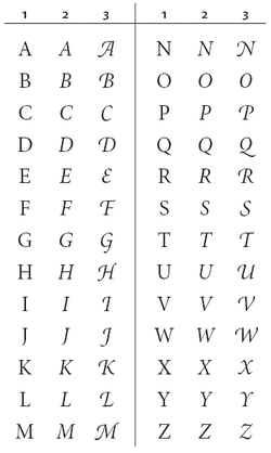 [edit]Most typefaces with swashes are serif fonts, among which (if present) they are often found solely in italics. Advanced digital fonts often supply two italic designs: one with swashes and a more restrained standard italic.