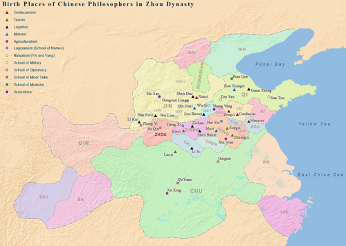 Early Taoism drew on the ideas found in the religion of the Shang dynasty and the Zhou dynasty, such as their use of divination, ancestor worship, and the idea of Heaven (Tian) and its relationship to humanity.[7] According to modern scholars of Taoism, such as Kirkland and Livia Kohn, Taoist philosophy also developed by drawing on numerous schools of thought from the Warring States period (4th to 3rd centuries BCE), including Mohism, Confucianism, Legalist theorists (like Shen Buhai and Han Fei, which speak of wu wei), the School of Naturalists (from which Taoism draws its main cosmological ideas, yin and yang and the five phases), and the Chinese classics, especially the I Ching and the Lüshi Chunqiu.[50][7][8]