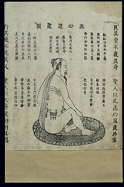 The Ming era saw the rise of the Jingming ("Pure Illumination") school to prominence, which merged Taoism with Buddhist and Confucian teachings and focused on "purity, clarity, loyalty and filial piety".[106][107] The school derided internal and external alchemy, fasting (bigu), and breathwork. Instead, the school focused on using mental cultivation to return to the mind's original purity and clarity (which could become obscured by desires and emotions).[106] Key figures of this school include Xu Xun, Liu Yu, Huang Yuanji, Xu Yi, and Liu Yuanran. Some of these figures taught at the imperial capital and were awarded titles.[106] Their emphasis on practical ethics and self-cultivation in everyday life (rather than ritual or monasticism) made it very popular among the literati class.[108]