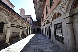 [edit]Surrounded by high walls, the First Courtyard (I. Avlu or Alay Meydanı) functioned as an outer precinct or park and is the largest of all the courtyards of the palace. The steep slopes leading towards the sea had already been terraced under Byzantine rule.[30] Some of the historical structures of the First Courtyard no longer exist. The structures that remain are the former Imperial Mint (Darphane-i Âmire, constructed in 1727), the church of Hagia Irene and various fountains. The Byzantine church of Hagia Irene was used by the Ottomans as a storehouse and imperial armoury.[31] This courtyard was also known as the Court of the Janissaries or the Parade Court. Court officials and janissaries would line the path dressed in their best garb. Visitors entering the palace would follow the path towards the Gate of Salutation and the Second Courtyard of the palace.[32]