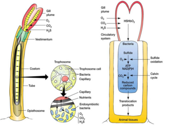 [edit]In both these animals, the symbiotic bacteria that live in the trophosome oxidize sulfur or sulfide found in the worm's environment and produce organic molecules by carbon dioxide fixation that the hosts can use for nutrition and as an energy source. This process is known as chemosynthesis or chemolithoautotrophy.[citation needed]
