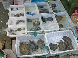 The most common species raised by Chinese turtle farmers is the Chinese softshell turtle (Pelodiscus sinensis), accounting for over 97% of all reported sales, both in terms of head count (124.8 million in the 684-farm sample) and weight.[1] Large-scale production of this species appears to have been successful in satisfying China gourmets' demand for its meat, which has been reflected in the price drop: while in the mid-1990s, wild-caught softshelled turtles retailed for CNY 500 per Chinese pound or jin (500 g), and farm-raised ones at over CNY 200 / Chinese pound,[17] by 1999 the price for farm-raised softshelled turtles dropped to CNY 60 per Chinese pound,[18] and by 2009, to merely CNY 15-16 per Chinese pound.[17] Other species bred and raised in large numbers (in excess of 10,000 per year, each) in China are the wattle-necked softshell turtle (Palea steindachneri), Chinese pond turtle (Chinemys reevesii), yellow pond turtle (Mauremys mutica), Chinese stripe-necked turtle (Ocadia sinensis) and red-eared slider (Trachemys scripta elegans).[10]