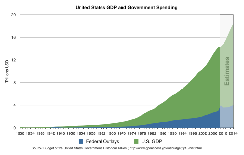 [edit]Many of the debates surrounding the United States federal budget center around competing macroeconomic schools of thought. In general, Democrats favor the principles of Keynesian economics to encourage economic growth via a mixed economy of both private and public enterprise, a welfare state, and strong regulatory oversight. Conversely, Republicans and Libertarians generally support applying the principles of either laissez-faire or supply-side economics to grow the economy via small government, low taxes, limited regulation, and free enterprise.[72][73] Debates have surrounded the appropriate size and role of the federal government since the founding of the country. These debates also deal with questions of morality, income equality, and intergenerational equity. For example, Congress adding to the debt today may or may not enhance the quality of life for future generations, who must also bear the additional interest and taxation burden.[74]
