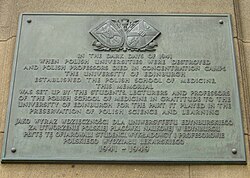 The Polish School of Medicine was established in 1941 as a wartime academic initiative. While it was originally intended for students and doctors in the Polish Armed Forces in the West, civilians were also allowed to take the courses, which were taught in Polish and awarded Polish medical degrees.[74] When the school was closed in 1949, 336 students had matriculated, of which 227 students graduated with the equivalent of an MBChB and a total of 19 doctors obtained a doctorate or MD.[75] A bronze plaque commemorating the Polish School of Medicine is located in the Quadrangle of the old Medical School in Teviot Place.[76]