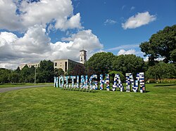 University Park Campus, to the west of Nottingham city centre, is the 330-acre (1.3 km2) main campus of the University of Nottingham. Set around its lake and clock-tower and with extensive parkland greenery,[39][40] University Park has won several awards for its architecture and landscaping, and was claimed to be the greenest campus in the country in 2009 after winning seven Green Flag Awards.[41]