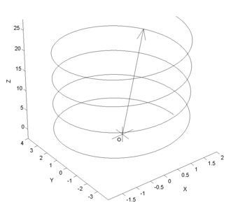 The vector shown in the graph to the right is the evaluation of the function near t = 19.5 (between 6π and 6.5π; i.e., somewhat more than 3 rotations). The helix is the path traced by the tip of the vector as t increases from zero through 8π.