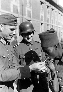 [edit]Germany took two million French soldiers as prisoners-of-war and sent them to camps in Germany. About a third had been released on various terms by 1944. Of the remainder, the officers and NCOs (corporals and sergeants) were kept in camps but were exempt from forced labour. The privates were first sent to "Stalag" camps for processing and were then put to work. About half of them worked in German agriculture, where food rations were adequate and controls were lenient. The others worked in factories or mines, where conditions were much harsher.[66]