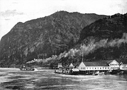 In 1915, the community had two salmon canneries, a large pulp and paper mill, and a public school, none of which remained by 1990.[3] Warrendale students later attended Bonneville Grade School in Dodson, which closed in 1996.[6][7] A salmon cannery established here in 1870 was the most prominent along the mid-Columbia River at that time.[3] Frank Warren's cannery used a fish wheel upstream at Hamilton Island on the Washington side of the river to harvest salmon, which were transported down the island using a tramway, the remnants of which are still located in Fort Cascades Historic Site.[8] The fish were then transported across the river to Warrendale for processing.[8] The tramway operated until 1930, and fish wheels were outlawed in Washington in 1934.[8] Warren also owned a cannery in Cathlamet, Washington.[8]