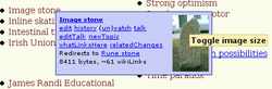 - One click access to edit page, page history, most recent edit, edits by most recent contributor,[a] changes since my edit,[a] move page, what links here, related changes, watch or unwatch, protect or unprotect (for administrators), talk page, edit talk page and start new topic in talk page