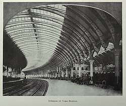 [edit]The first York railway station was a temporary wooden building on Queen Street outside the walls of the city, opened in 1839 by the York and North Midland Railway (Y&NMR). It was succeeded in 1841, inside the walls, by what is now York old railway station.[5] On 31 July 1854, the Y&NMR merged with the Leeds Northern Railway and the York, Newcastle & Berwick Railway to form the North Eastern Railway (NER); shortly thereafter, it became clear that the company's desire to run through trains between London and Newcastle without needing to reverse out of the old York station to continue their journey would necessitate change, specifically the construction of a new through station outside the city walls.[6] Furthermore, as the NER's dominance of rail traffic in the region expanded through further mergers, several directors desired an expansive and elaborate facility to serve York, where the company was headquartered. During 1866, Parliament authorised the construction of this new railway station.[7][8]