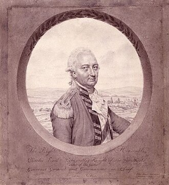 The British presence in the south consisted of the strongly fortified ports of Savannah, Georgia and Charleston, South Carolina, and a string of outposts in the interior of those two states.[17] Although the strongest outposts were relatively immune to attack from the Patriot militia that were their only formal opposition in those states, the smaller outposts, as well as supply convoys and messengers, were often the target of militia commanders like Thomas Sumter and Francis Marion.[18] Portsmouth had most recently been occupied in October 1780 by a force under the command of Major General Alexander Leslie, but Lieutenant General Charles, Earl Cornwallis, commanding the British southern army, had ordered them to South Carolina in November.[19] To replace General Leslie at Portsmouth, General Clinton sent 1,600 troops under General Benedict Arnold (recently commissioned into the British Army as a brigadier) to Virginia in late December.[20]