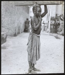 Slavery in Zanzibar was known to be hard, with slaves often subjected to bad treatment. Slaves were often forced to convert to Islam.[39] Many enslavers had a reputation of being cruel slave owners, particularly plantation owners, such as Princess Khole; the Hinaway family had 600 slaves on their plantations and was known to treat their slaves harshly; caught ranaways were punished by being placed in the Mapinguni (the place of shackles), Mgooni (the fish trap) or Mashimoni (the pits).[40] Manumissions normally took place at the deathbed of an enslaver who wished to be given a reward for it in the afterlife, but was otherwise rare; slaves often attempted to escape, particularly from the plantations, and often died from the punishment when caught.[41]