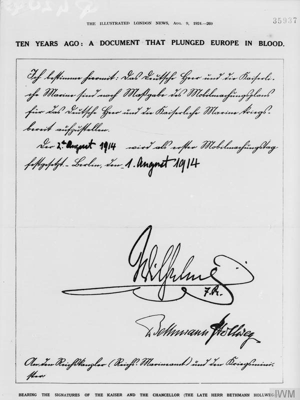 - Kaiser Wilhelm II, marginal note to Pourtalès’ report from St. Petersburg of 30 July 1914, in Kautsky, Karl (ed.): Die deutschen Dokumente zum Kriegsausbruch, 4 vols., Charlottenburg 1919, No. 401, English translation in Mombauer, Annika (ed.): The Origins of the First World War. Diplomatic and military documents, Manchester 2013, p. 457f.↑
