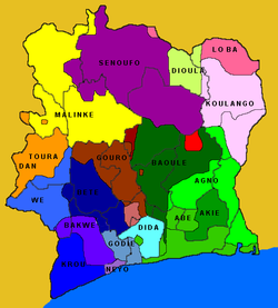 - ↑ En oktobro 1985 la registaro dekretis ke la lando estu nomita Côte d'Ivoire en franca ortografio en ĉiuj lingvoj