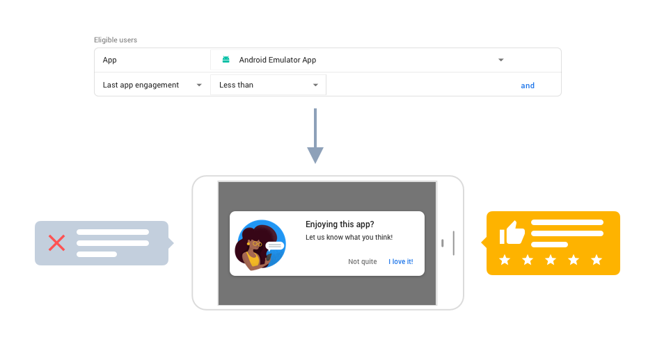 • Target users with a Last app engagement between one to seven days to make sure they are active. Ask your engaged users if they are enjoying your app. Depending on their answer, use a smart link to direct them to Google Play for a review or to a feedback survey.