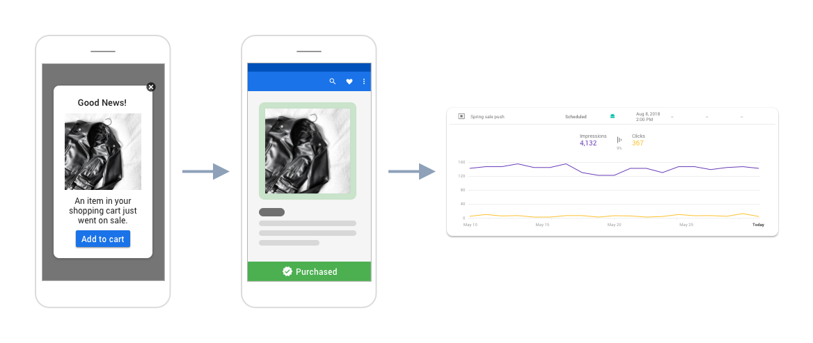 • Offer a promotional message with the Modal template's action button to discounted items. Firebase lets you know how many users received the message, how many clicked on it, and how many completed conversion event such as an e-commerce purchase.