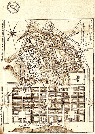 Enfin, de nombreuses améliorations sont apportées par les Français aux villes du Péloponnèse (écoles, services de poste, imprimeries, ponts, places, fontaines, jardins, etc.)[44],[47]. Le commandant du génie de l’expédition de Morée, le lieutenant-colonel Joseph-Victor Audoy est notamment chargé par le gouverneur de la Grèce Ioánnis Kapodístrias d’établir les premiers plans d'urbanisme de l'histoire moderne du pays[N 10]. Il fait ainsi construire à partir du printemps 1829 les villes nouvelles de Modon (l'actuelle Méthoni) et de Navarin (l'actuelle Pylos) à l’extérieur des murs des forteresses, sur le modèle des bastides françaises de la région du Tarn dont il est originaire et des villes des Îles Ioniennes (qui partagent des éléments communs, comme une place centrale d'allure géométrique bordée par des galeries en arcades ou couverts comme à Pylos)[44]. Il fait également édifier, entre décembre 1829 et février 1830, la célèbre école d'enseignement mutuel capodistrienne de Modon[47]. Toutes ces villes se repeuplent alors rapidement et retrouvent leur activité d'avant-guerre[N 11]. L'exemple de la modernisation rapide de Patras, dont les plans viennent tout juste d’être dessinés par les capitaines de l'expédition française Stamátis Voúlgaris et Auguste-Théodore Garnot, est longuement décrit dans ses Souvenirs[48] par Jacques Mangeart, venu dans la ville avec le lieutenant-colonel philhellène Maxime Raybaud y installer une imprimerie et y fonder le journal franco-grec Le Courrier d'Orient en 1829[23].