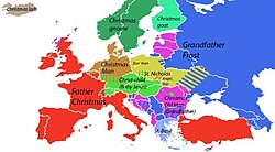 [modifier | modifier le code]La légende de saint Nicolas est établie depuis le Moyen Âge : on le célèbre le 6 décembre, mais selon le calendrier julien, le jour tombe le 19 décembre. Ce rite vient naturellement se confondre avec ceux, plus anciens, de célébration du solstice d'hiver. Personnage populaire de l'hagiographie chrétienne, son culte se développe rapidement en Europe occidentale après l'arrivée de ses reliques à Bari en Italie en 1087.